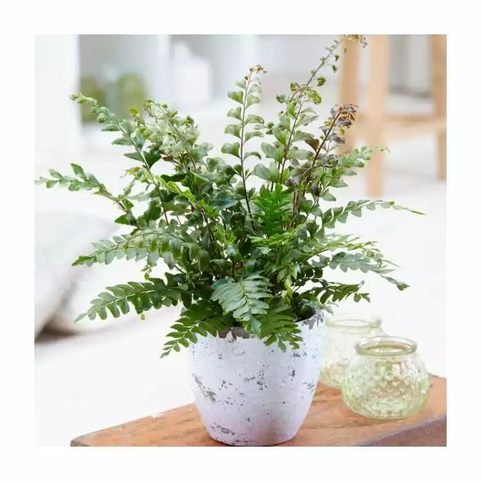 Ferns are some of the oldest varieties of plants still in existence today and they grow all over the world in differing shapes and sizes. This Didymochlaena is better known by its common name of Green Fern and it’s a wonderful variety with red stalk fronds filled with small green leaves. They can be found all over the world growing in shady rock crevices or river banks. These plants love humidity; a shadier spot in a bright bathroom can be the perfect location, but humidity can be achieved anywhere in the house with a spray bottle to mist the leaves. The beautiful foliage of these ferns makes them a great houseplant for adding life and colour to any space.