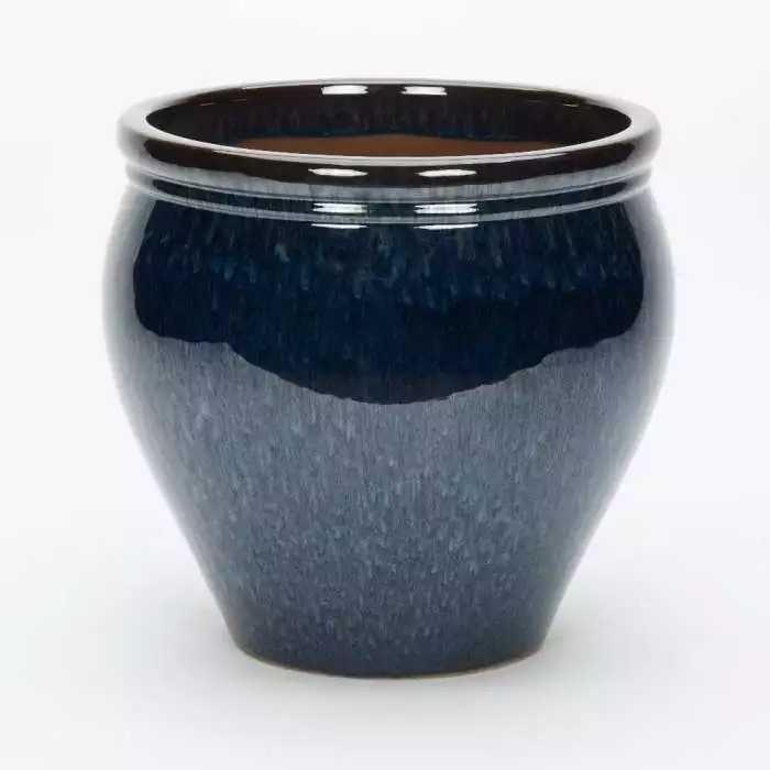 Beautiful blue glazed ceramic planter with a unique flowing colour finish and deep lustre. A striking alternative to traditional glazed pots, ideal for drawing attention to feature displays.