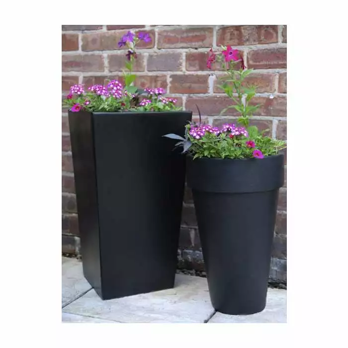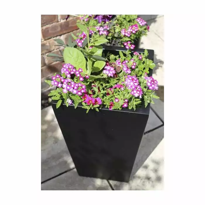 Thanks to Mr V for these photos of the small Tall Flared Square Fibreglass Planter and Black Montroe Polystone Planter in his garden.