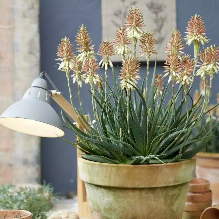 A small aloe succulent cactus indoor houeplant with spikes of apricot flowers. Position: bright but indirect light Soil: good potting compost, well drained Rate of growth: slow Flowering period: early summer generally Hardiness: tender (will need winter protection) The fleshy grey-green foliage of this gorgeous aloe is topped with upright spikes of creamy yellow flowers, which open over several weeks from apricot coloured buds. This sun-loving plant makes a colourful addition to the cacti and succulent collection, and will be happiest on a bright windowsill. Please note that the pot in the photograph is not supplied with the plant (which is sent out in a standard nursery pot). They do however make excellent potted plants, and if you wish to pot yours up, we do have a wide range of pots on our website to choose from. Home care: Water moderately when growing, and sparingly when dormant through the winter months. Feed with a balanced liquid fertiliser 2-3 times during the growing season.