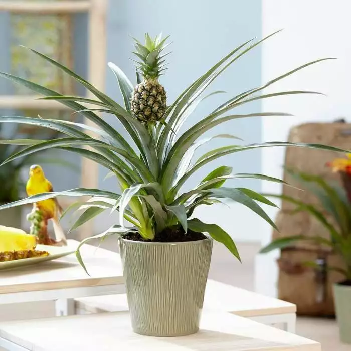 A ornamental pineapple makes an interesting plant for a sunny windowsill. Position: sun/partial shade Soil: good potting compost Rate of growth: average Hardiness: tender (indoors only) Current height: approximately 40cm (+ or – 10% including the pot) Pot cover: choose a 14cm pot cover to give a good fit over the pot A curious plant with an ornamental pineapple growing from the top, but this pineapple is not for eating! Part of the Bromeliad plant family native to Tropical America it has swordlike spiny green leaves, held in a dense rosette, with the fruit held in the centre on a sturdy stalk. It’s a real sun lover, so pop it on a sunny kitchen windowsill to be appreciated. Please note that the pot in the photograph is not supplied with the plant (which is sent out in a simple nursery pot). They do however make excellent potted plants, and if you wish to pot yours up, we do have a wide range of pots on our website to choose from. Home care: Allow the soil to dry out between watering. You can feed it with a balanced liquid fertiliser from spring to autumn. There are 2 ways to propagate this plant – either cut off the foliage tuft from the top of the fruit, peel of the lower leaves and then pot this up, or wait until the parent plant produces offsets, and pot these up.