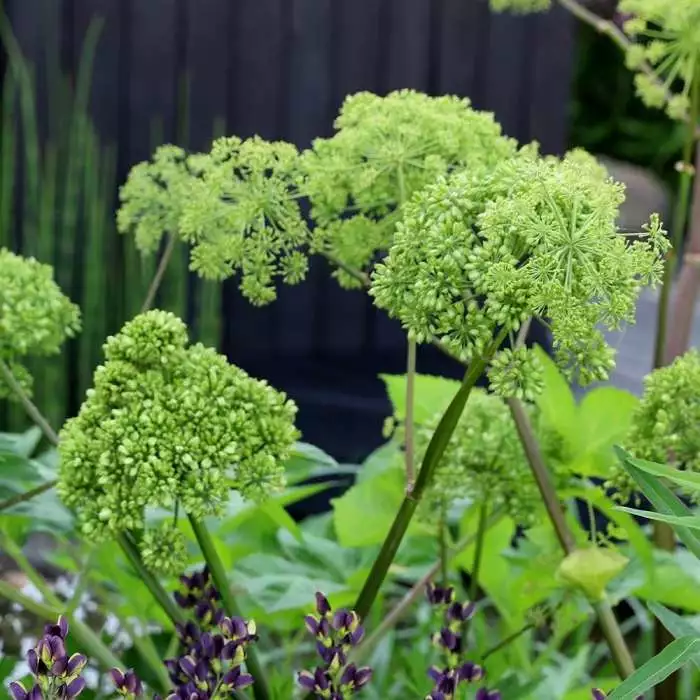 Stunning accent plant. Position: full or partial shade Soil: deep, moist, fertile, loamy soil Rate of growth: average Flowering period: June to July Hardiness: fully hardy (but short-lived) Pretty, deeply cut leaves, which in early summer, are crowned by domes of tiny, luminous green flowerheads. This angelica is biennial and dies back after flowering, but will self-seed freely in the right spot. It performs best in moist shade and it has a wide range of culinary and medicinal uses. Try it at the back of a herb garden, or among grasses and perennials, and give it space to express itself. A stunning, architectural plant that adds height and drama to a border. Garden care: This plant usually dies after flowering, but if flowering is prevented, or the spent flowers are removed before they set seed, then it will often flower again for a second year.