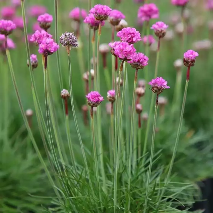 A coastal, drought-tolerant, grassy-leaved perennial with purple-pink flowers. Position: full sun Soil: well-drained, neutral to alkaline soil Rate of growth: average Flowering period: June to August Hardiness: fully hardy Vibrant purple-pink flowers form in bobble-like clusters on top of the upright stems in summer. These seem to hover above the clumps of rich green foliage, and as they fade, papery seedheads follow on. A tough and undemanding sun-lover, it will become drought tolerant once established and will flourish in a seaside location. Garden care: Remove spent flowerheads after they have faded.
