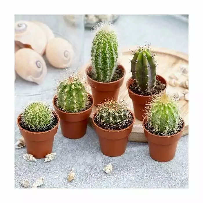 Great for mixed arrangements, or just lining up on the windowsill. Position: bright but indirect light Compost: specialist cacti compost Rate of growth: slow Hardiness: tender (indoors only) Current height: approximately 7cm (+ or – 10% including the pot) This set of 6 mixed (unnamed and unlabelled) cacti makes a great starter collection, and will look fab lined up on a bright windowsill, potted up together into one large bowl-shaped planter, or an open terrarium-style planter. They are incredibly easy to look after, so make a great option for the first-time house plant gardener. Please note however that as this is a mixed collection, the plants you receive may be different varieties from those in the photo. Home care: Place in a bright spot and in spring and summer, water when the compost gets dry, but make sure they never sit in excess water for any length of time. In autumn cut back on the water and keep them almost dry throughout the winter – watering only if they start to look a bit shrivelled. Avoid a humid atmosphere (no bathrooms or steamy kitchens) and in the warmer months, open a window or door occasionally so they can enjoy the fresh air. Repot every year or two into slightly larger pots using cacti compost. You will find it easier to tackle if you concertina a sheet of newspaper and then fold this around the spines, leaving a ‘tail’ that you can use to lift the plants out of one pot and into another. Otherwise invest in some thorn-proof gloves!