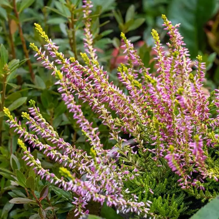A pinkish-white flowering heather. Position: full sun Soil: well-drained, humus-rich, acid soil or ericaceous compost Rate of growth: average Flowering period: August to October Hardiness: fully hardy Small pinkish-white buds form along the length of the upright stems from late summer, never fully opening, but offering several months of late colour. This gorgeous heather is noted for its yellow-gold shoot tips, which add further interest during its flowering season. Garden care: When planting incorporate lots of composted pine needles or leaf-mould into the planting hole. In March or April cut back the flowered shoots to within 2.5cm (1in) of the old growth.