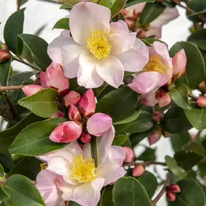 A compact and long-flowering camellia. Position: partial shade (but not east-facing) Soil: moist but well-drained, humus-rich, acid soil (or ericaceous compost for container-grown specimens) Rate of growth: average Flowering period: January to March Hardiness: fully hardy Opening from deep pink buds in late winter and early spring, the simple and elegant blush pink flowers of this compact camellia are lightly perfumed. Ideal for pots as well as borders, it will also make a beautiful, informal screen or hedge, because its lustrous evergreen foliage will provide year-round form and structure. Garden care: To prevent damage to the emerging buds and flowers protect from cold, dry winds and early morning sun. Water established plants in dry weather to prevent bud drop. Apply a balanced liquid fertiliser in mid-spring and again in June. Top-dress annually with shredded bark or well-rotted leaf mould. After flowering lightly trim or prune any branches that spoil the appearance of the plant.