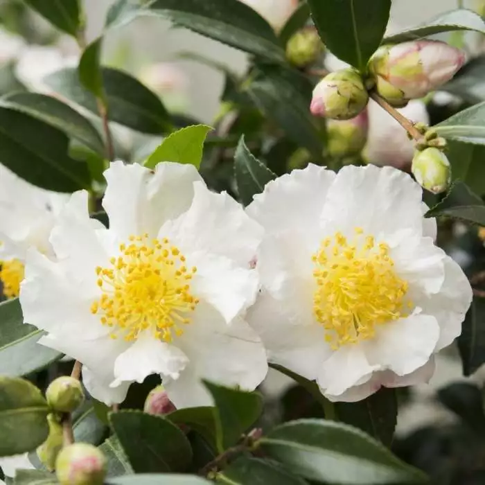 Glowing white flowers in the autumn garden. Position: partial shade (but not east-facing) Soil: moist but well-drained, humus-rich, acid soil (or ericaceous compost for container-grown specimens) Rate of growth: average Flowering period: October to December Hardiness: fully hardy The glowing white flowers of this autumn-flowering camellia really stand out against the backdrop of lustrous green leaves – offering a bright splash of colour when little else is in bloom. A versatile and relatively undemanding evergreen, it’s useful for informal hedging, larger patios, or offering year round structural interest to borders. Garden care: To prevent damage to the emerging buds and flowers, protect from cold, dry winds and early morning sun. Water established plants in dry weather to prevent bud drop. Apply a balanced liquid fertiliser in mid-spring and again in June. Top-dress annually with shredded bark or well-rotted leaf mould. After flowering lightly trim or prune any branches that spoil the appearance of the plant.