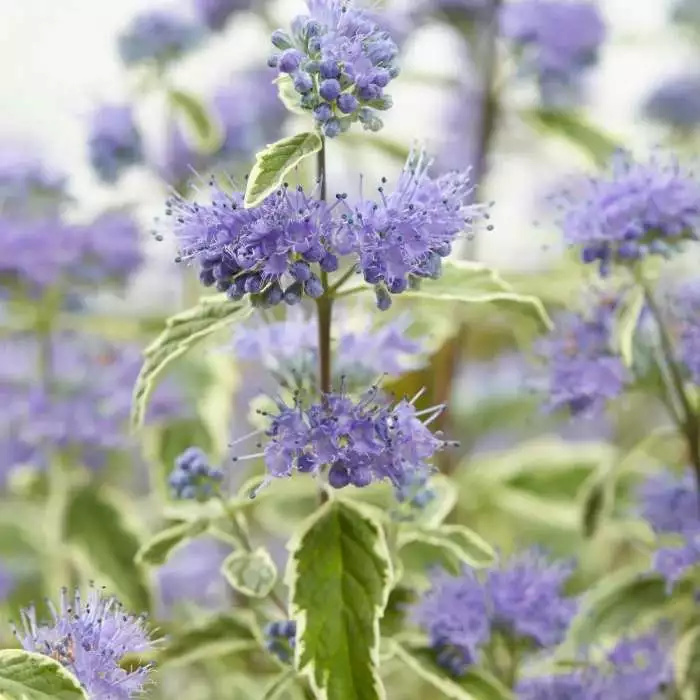 A new, variegated caryopteris. Position: full sun Soil: moderately fertile, light, well-drained soil Rate of growth: average Flowering period: August to September Hardiness: fully hardy Only recently introduced, this late flowering shrub is already in demand for its handsomely variegated, aromatic foliage and clusters of mid-blue flowers, which form in tiers along the length of the stems from late summer. Becoming drought tolerant once established, it will also thrive in coastal conditions. Garden care: In March prune all of the flowered stems back hard to the permanent framework. After pruning apply a generous 5-7cm (2-3in) mulch of well-rotted garden compost around the base of the plant.