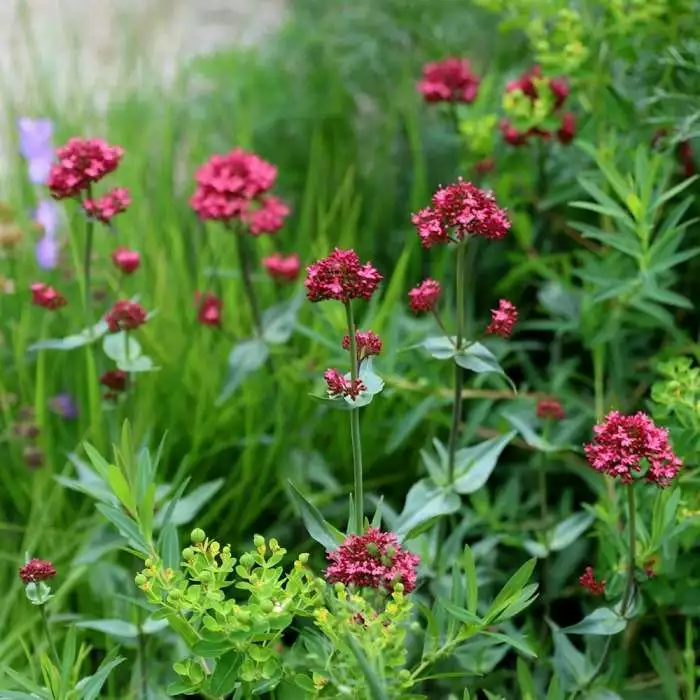 Perfect for a seaside garden. Position: full sun Soil: well-drained, neutral to alkaline Rate of growth: fast-growing Flowering period: July to October Hardiness: fully hardyDense clusters of reddish-pink flowers appear from July to October on tall, fleshy stems with glaucous leaves. Red valerian is long flowering and easy to grow. It’s ideal for a sunny wildflower or seaside garden with poor but well-drained soil, or for growing between the cracks in walls. It self-seeds freely and prefers a chalky or alkaline soil. Garden care: Deadhead regularly throughout the summer to prolong flowering. In autumn cut the plant back down to the ground and compost the dead stems.
