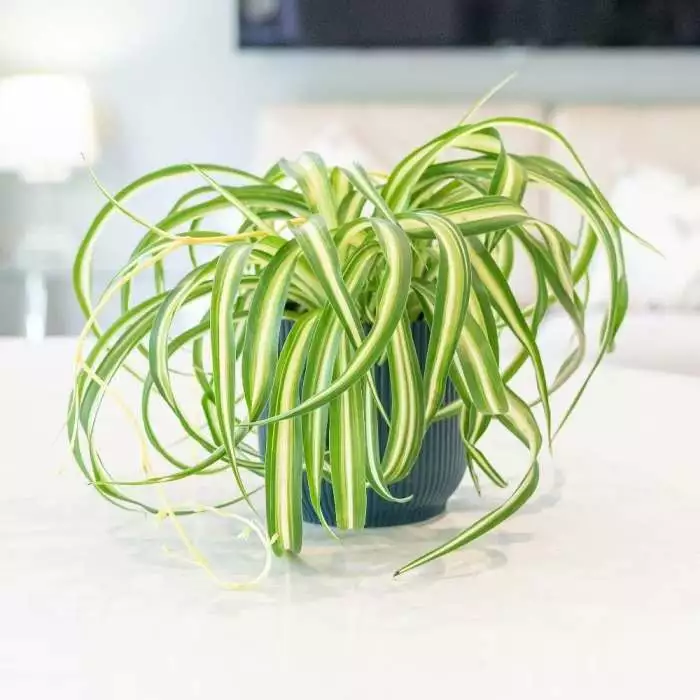 A colourful, but tough and undemanding house plant. Position: bright but indirect light Soil: general-purpose potting compost Rate of growth: fast Hardiness: tender (indoors only) Current height: approximately 25cm (+ or – 10% including the pot) Pot cover: choose a 12cm pot cover to give a good fit over the pot ‘Bonnie’ is strongly variegated and has been bred for its swirly curly leaves. As it matures it develops stems, each of which has a baby plant at its tip. These can be pegged down into compost, and when rooted the stem can be cut and you will have another plant – great for jumble sales or gifts for friends! This houseplant is incredibly popular as it is so easy to grow – just place it in a well-lit spot, water, and watch it grow! Please note that the pot in the photograph is not supplied with the plant (which is sent out in a simple nursery alternative), but we have a wide and wonderful range on our website to choose from. Home care: Water freely when in growth, but keep drier in winter. Mist the leaves every so often with water to increase humidity and make sure the winter temperatures stay above 8°C. Repot when it has outgrown its pot in winter.