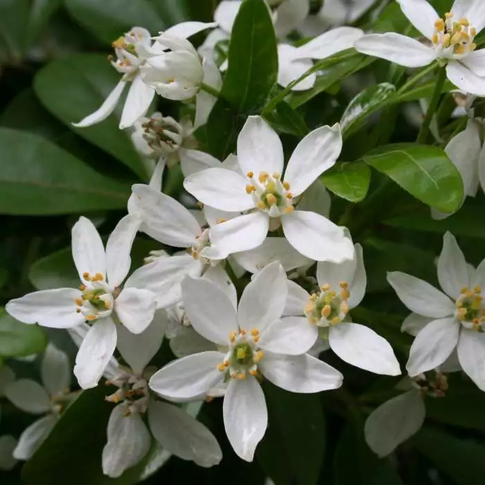 Wonderfully scented white flowers. Position: full sun to partial shade Soil: fertile, well-drained soil Rate of growth: fast-growing Flowering period: May, often with a second flush in late summer or autumn Hardiness: fully hardy Wonderfully scented, star-shaped, white flowers appear in late spring among glossy, aromatic, dark green leaves. This handsome, compact and easy-to-grow shrub is a valuable garden mainstay for a protected site in sun or part shade, although in shade it may not flower. The glossy, evergreen leaves provide an excellent backdrop for medium-sized perennials and pale-grey or purple foliage plants. Garden care: Prune established plants in spring immediately after flowering, removing 25-30cm (10-12in) of the flowered stems. This encourages a second flush of flowers in late-summer and autumn. At the same time, remove any frost-damaged stems to the base.