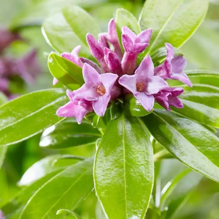 Highly scented purple-pink flower clusters. Position: full sun or partial shade Soil: moderately fertile, well-drained, humus-rich soil Rate of growth: slow-growing Flowering period: March to April Hardiness: frost hardy (may need winter protection)Pointed purple-pink buds form at the tips of the stems of this evergreen shrub in spring, opening to soft pink tubular flowers, which emit a deliciously sweet perfume. Tolerant of partial shade, it is ideal for a woodland setting with drifts of spring flowering bulbs at its feet. Garden care: Keep pruning to a minimum since the plant is susceptible to die-back. Where necessary after flowering, lightly trim to remove misplaced branches and maintain a compact habit.