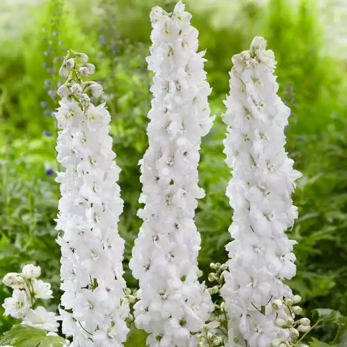A tall, perennial delphinium with pure white flowers for cottage gardens. Position: full sun Soil: fertile, well-drained soil Rate of growth: average Flowering period: June and July Hardiness: fully hardy This tall impressive white delphinium certainly makes a statement!It grows to a height of 1.5m (5.5ft) and displays spectacular white florets with white eyes. It is certainly a very showy plant and compliments perfectly the blues which may grow nearby. Garden care: Stake with bamboo canes in mid-spring. During the growing season apply a balanced liquid fertiliser every 2-3 weeks and wearing gloves cut back the faded flower stems to a flowering sideshoot. At the end of autumn cut back and compost the faded flower-stems