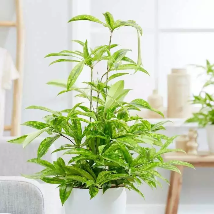 A decorative foliage house plant. Position: bright indirect light Soil: good potting compost Rate of growth: average Hardiness: tender (indoors only) Current height: approximately 60cm (+ or – 10% including the pot) Pot cover: choose an 18cm pot cover to give a good fit over the pot The fresh green foliage of this decorative house plant is streaked along its length with darker green, and it also has a generous smattering of yellow freckles across its face. Creating a lush, almost oriental feel, its variegations will become less prominent in lower light levels. Please note that the pot in the photograph is not supplied with the plant (which is sent out in a simple nursery pot). They do however make excellent potted plants, and if you wish to pot yours up, we do have a wide range of pots on our website to choose from. Home care: Water well in the growing season, but less so in winter. Misting the leaves with water will help keep the humidity levels high, as well as keeping the leaves dust-free. Repot in spring every couple of years and keep temperatures above 10°C in winter.