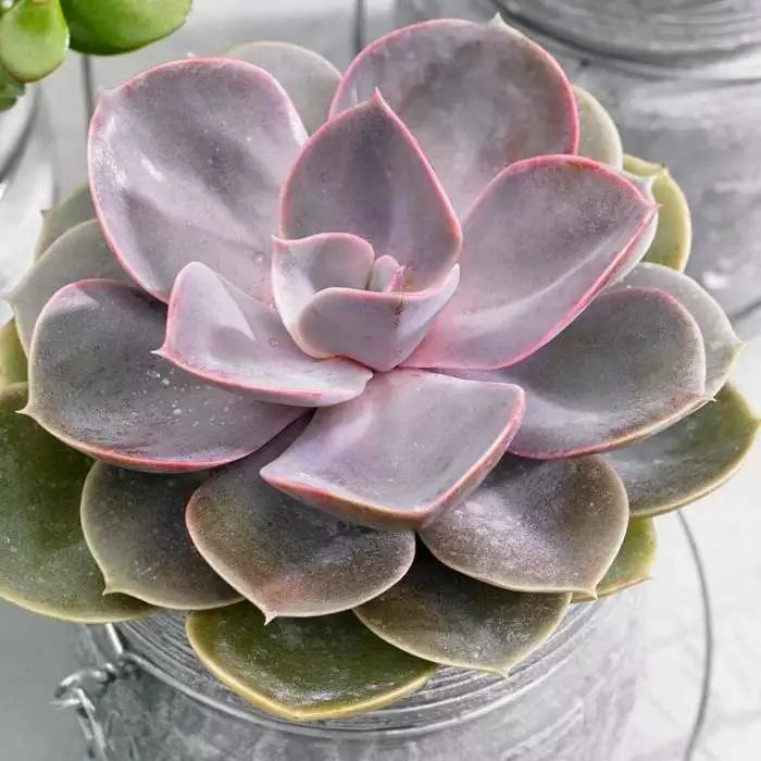 Stunning succulent that is simple to look after. Position: bright, indirect light Soil: good potting compost Rate of growth: slow Hardiness: tender (indoors only) Current height: approximately 10cm (+ or – 10% including the pot) Pot cover: choose a 14cm pot cover to give a good fit over the pot Wonderfully decorative evergreen succulent with fleshy, obovate leaves growing as a rosette. These rosettes can be up to 15cm wide, developing a beautiful purple sheen which grows in intensity in brighter light. Naturally it is grown for this lovely foliage, but this interesting plant can also produce panicules of pale red flowers. Please note that the pot in the photograph is not supplied with the plant (which is sent out in a simple nursery pot). They do however make excellent potted plants, and if you wish to pot yours up, we do have a wide range of pots on our website to choose from. Home care: Needs very little care, except that the leaves are delicate so need to be handled with care. Water sparingly when required, avoiding the actual rosette of leaves, and keep in an even warm environment. As an added bonus, this plant often produces small baby plants or ‘chicks’ (hence the common name ‘hen and chicks’) at the base of the main rosette of leaves. Cut these off and pop them into some cactus potting compost to give to all your friends!