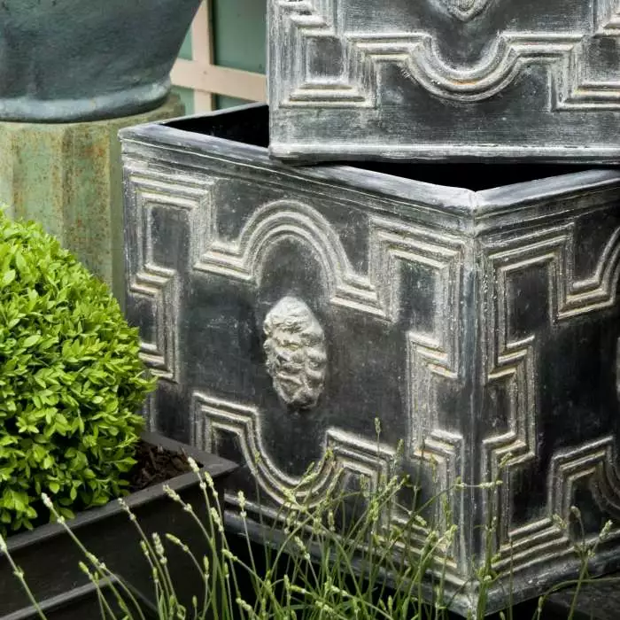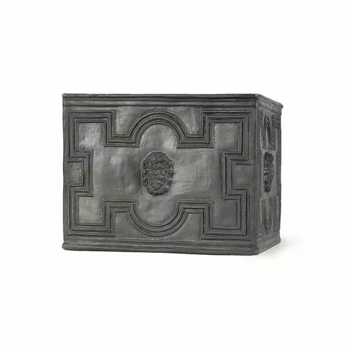 This top quality formal planter looks like lead but is in fact made from fibreglass and resin, with an authentic faux lead finish.
