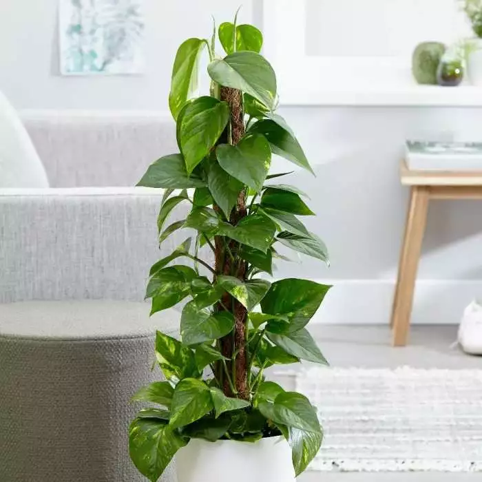 An exotic-looking houseplant with variegated yellow and green foliage. Position: bright filtered or indirect light Soil: good potting compost Rate of growth: average Hardiness: tender (indoors only) Current height: approximately 80cm (+ or – 10% including the pot) Pot cover: choose a 20cm pot cover to give a good fit over the pot This decorative climber has glossy, rich green leaves that are variously splashed with yellow. Not only does it look good though, it has also been hailed as one of the best houseplants for filtering and purifying the air. It has been trained to grow around a moss pole so has an upright habit, however if the aerial roots (which develop along the stems) do not have something to attach themselves to, then they will start to cascade down. Please note that the pot in the photograph is not supplied with the plant (which is sent out in a simple nursery pot). They do however make excellent potted plants, and if you wish to pot yours up, we do have a wide range of pots on our website to choose from. Home care: Water relatively freely when in active growth, making sure the compost dries out in-between, but keep drier in winter. Avoid draughts and mist the leaves regularly with water to increase humidity. Every so often put it under a cold shower to wash off the leaves and pinch out the growing tips to encourage bushier growth. Make sure the winter temperatures stay above 10°C and repot every couple of years.