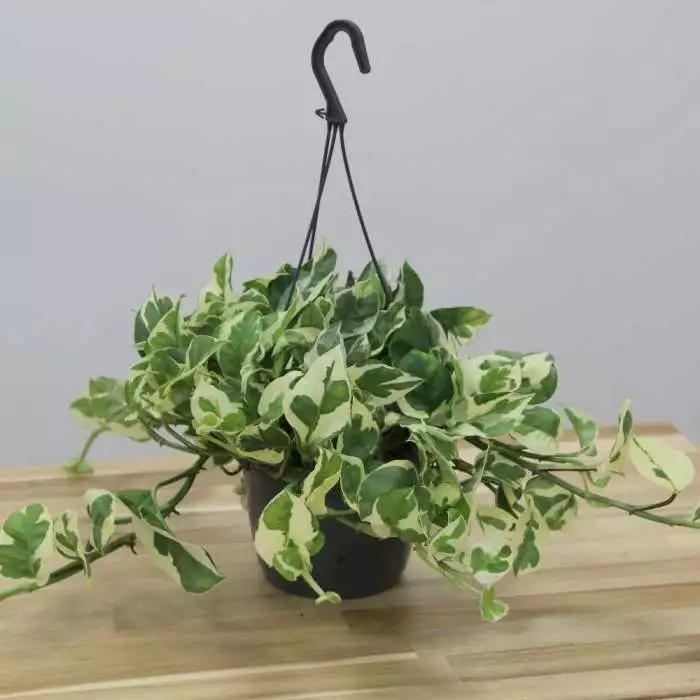Attractively variegated foliage. Position: bright filtered or indirect light Soil: good potting compost Rate of growth: average Hardiness: tender (indoors only) Current height: approximately 30cm (+ or – 10% including the pot) Pot: supplied in a hanging pot ready to hang The leaves of this trailing pothos are variously patterned with rich green and cream, and they form on cascading stems that cascade down over the edges of the pot. An ideal plant for the novice, it tolerates a degree of neglect and even puts up with a bit of shade – although the leaf variegations will become less pronounced in a darker corner. Home care: Water relatively freely when in active growth, making sure the compost dries out in-between, but keep drier in winter. Avoid draughts and mist the leaves regularly with water to increase humidity. Every so often put it under a cold shower to clean the leaves and pinch out the growing tips to encourage bushier growth. Make sure the winter temperatures stay above 10°C and repot every couple of years. Please note: all our indoor hanging pots include drainage holes to prevent waterlogging. We recommend taking them down to water in the sinkor on a saucer, and leaving them to drain before rehanging.