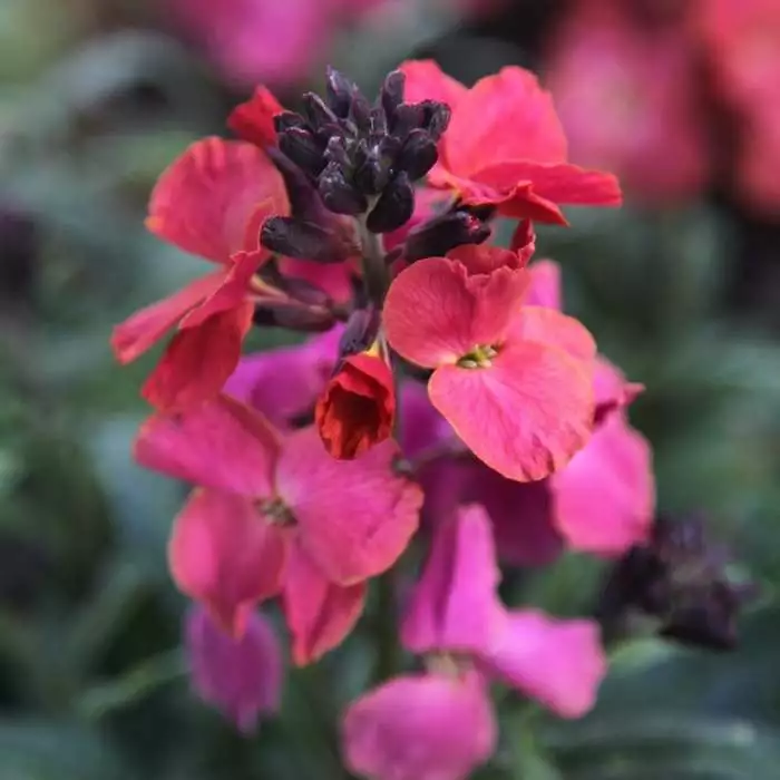 Create a multi-coloured effect for many months. Position: full sun Soil: poor to moderately-fertile, well-drained, neutral to alkaline soil Rate of growth: average to fast-growing Flowering period: February to August Hardiness: fully hardy Compact mounds of slender, evergreen foliage are topped with masses of fragrant flowers, which change colour from burnt orange to pinkish-purple as they age. This creates a very pretty and colourful effect as the season progresses. Garden care: Provide cloche protection where frosts are very severe or prolonged.