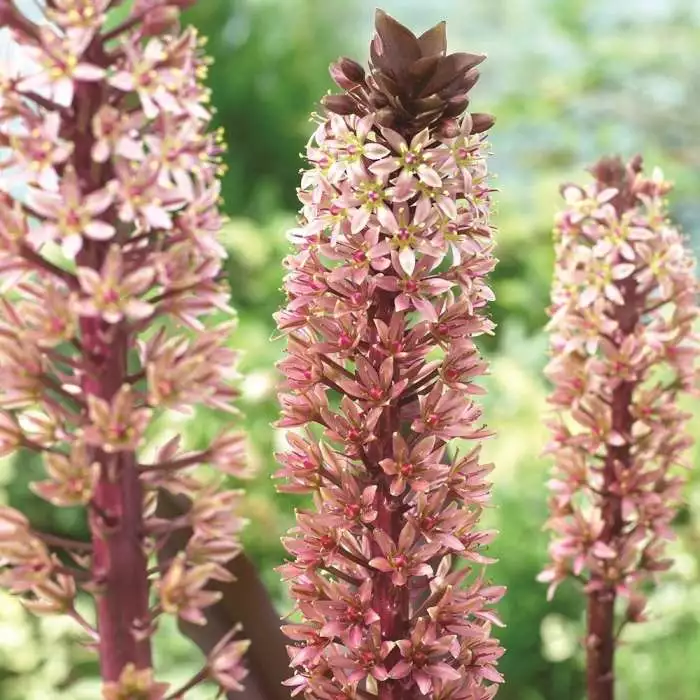 A striking and unusual addition to the border or patio. Position: full sun Soil: fertile, well-drained soil (or loam-based potting compost with sharp sand or grit for container-grown specimens) Rate of growth: average Flowering period: July to August Hardiness: borderline hardy (may need winter protection) Bulb size: 14+ This eucomis will make a striking and unusual addition to the border or patio pot – particularly in midsummer when the impressive spikes of burgundy red buds open to star-shaped rose pink flowers. The flowers of ‘Sparkling Rosy’ offer a long season of interest, but the foliage is attractive too – forming a neat rosette and initially having a purple flush. At the end of the flowering season, the seed pods provide yet another flash of interest. Garden care: Plant bulbs 12cm deep as soon as possible, allowing 20cm between each. In colder areas, provide some protection until the worst of the frosts have passed. Water freely during the growing season and sparingly during winter. Protect the crown of the plant with a dry winter mulch or overwinter indoors under glass. Top dress or repot container-grown specimens each spring.