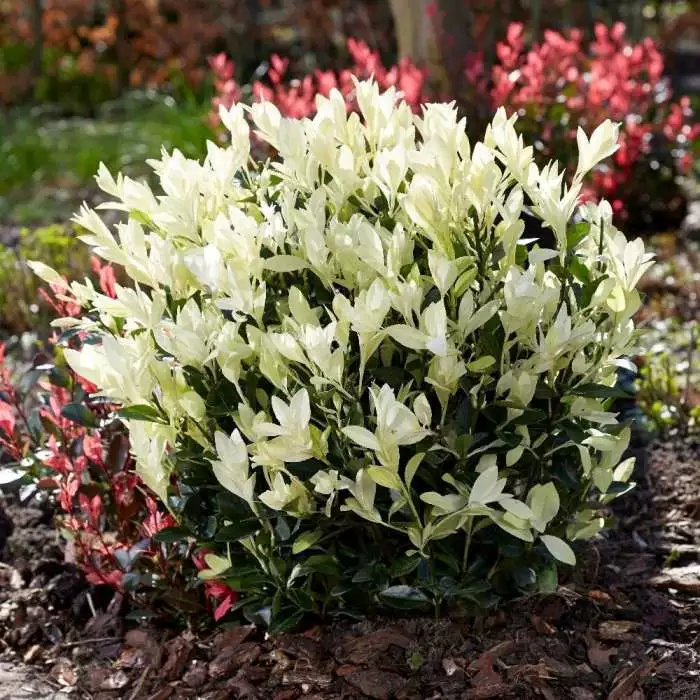 A semi-evergreen shrub euonymus with emerging white foliage . Position: full sun or partial shade Soil: any well-drained soil Rate of growth: slow growing Hardiness: fully hardy With its compact habbit and evergreen foliage makes it ideal for a low hedge or as a nice stand alone feature on a patio. The bright white new foliage in spring is really eyecatching, trim back in late spring and you will get a second flush later in the season. The new foliage will fade to a dark green. It will tolerate light shade so is perfect for brightening up a dark corner Garden care: Tip prune young plants in mid to late spring to encourage bushy growth and apply a generous 5-7cm (2-3in) mulch of well-rotted garden compost or manure around the base of the plant.