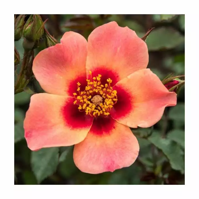 A floribunda with single pink through salmon to apricot flowers with a distinctive eye.Almost continuous flowering throughout the summer.