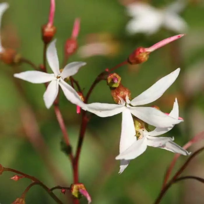 Charming, star shaped white flowers. Position: partial shade Soil: fertile, well-drained, neutral to slightly acidic soil Rate of growth: average Flowering period: June Hardiness: fully hardy A charming perennial that bears masses of delicate, star-shaped white flowers in midsummer. In autumn, the pretty, three-leafed foliage turns fiery red and the winter seedheads are a bonus too. Lovely towards the front of a shady woodland border, where the flowers can be appreciated. Garden care: Divide congested plants in spring or autumn. Protect young shoots from slug attack.