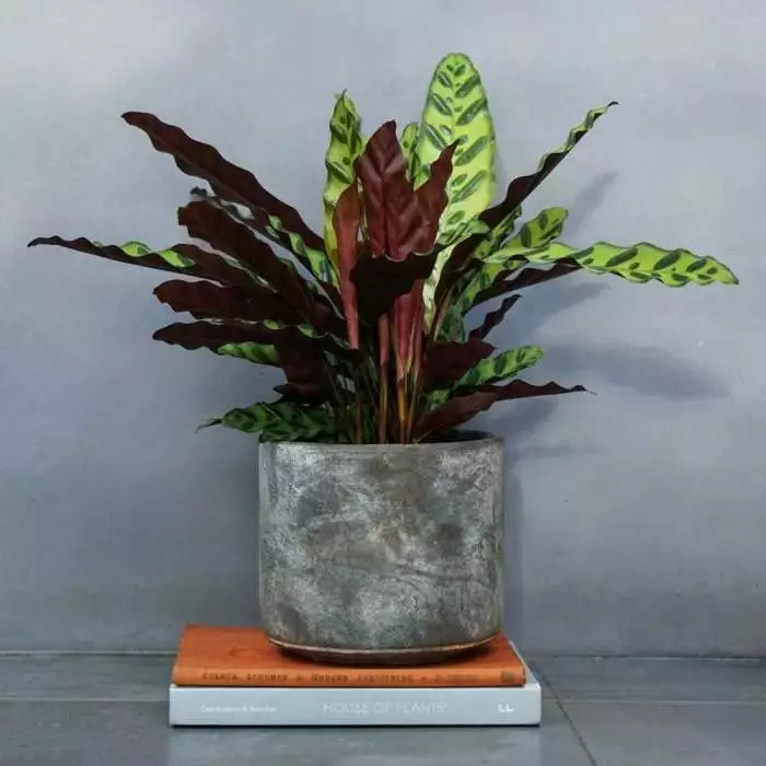 Grown for its tropical-looking foliage. Position: bright but indirect light Soil: good potting compost Rate of growth: average Hardiness: tender (indoors only) Current height: approximately 50cm (+ or – 10% including the pot) Pot cover: choose a 16cm pot cover to give a good fit over the pot The upper leaf surface of this attractive house plant is a lush-looking mix of apple green and rich forest green, while the underneath is a contrasting magenta-purple. This becomes more noticeable in low light levels when the leaves fold up on themselves, and become more upright. Please note that the pot in the photograph is not supplied with the plant (which is sent out in a simple nursery pot). They do however make excellent potted plants, and if you wish to pot yours up, we do have a wide range of pots on our website to choose from. Home care: Originating from tropical regions, they like relatively stable temperatures (ideally above 15°C) and a well-lit position that does not get direct sunlight (think steamy jungle!). They like to be kept well watered, although this can be cut back a little in winter, and they thrive in high humidity, so either grow it in a steamy room, mist it with water regularly, and/or sit the pot on a tray of dampened shingle.