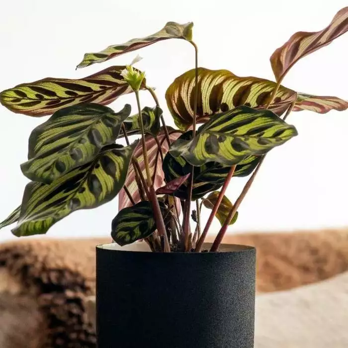 Attractive foliage houseplant . Position: bright but indirect light Soil: good potting compost Rate of growth: average Hardiness: tender (indoors only) Current height: approximately 25cm (+ or – 10% including the pot) Pot cover: choose a 14cm pot cover to give a good fit over the pot The name may not be familiar, but their ‘praying habit’ might be. These popular houseplants have a curious habit of raising and lowering their leaves over the course of a day. It’s also a distinctive houseplant with broadly ovate, pale-green leaves, fascinating dark green markings and red-purple undersides. Please note that the pot in the photograph is not supplied with the plant (which is sent out in a simple nursery alternative), but we have a wide and wonderful range on our website to choose from. Home care: Originating from tropical regions, they like relatively stable temperatures (ideally above 15°C) and a well-lit position that does not get direct sunlight (think steamy jungle!). They like to be kept well watered, although this can be cut back a little in winter, and they thrive in high humidity, so either grow it in a steamy room, mist it with water regularly, and/or sit the pot on a tray of dampened shingle.