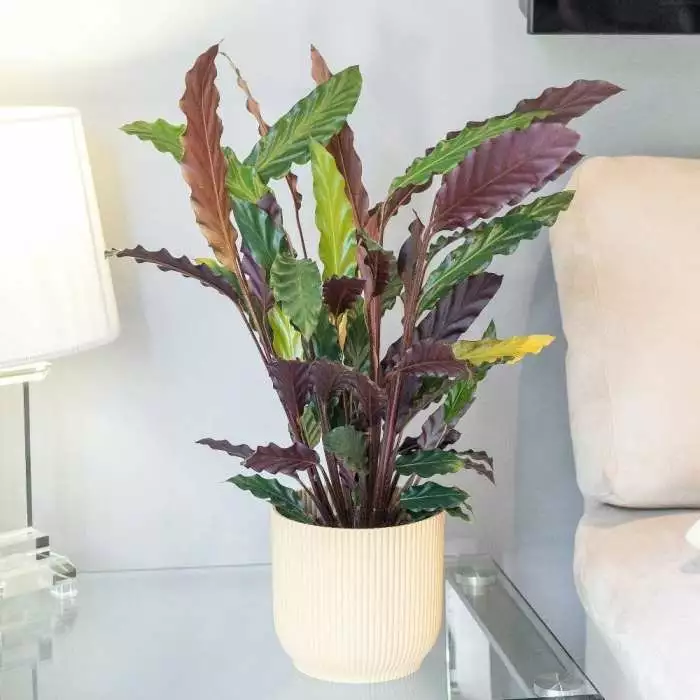 An upright, ruffled-foliage house plant . Position: bright but indirect light Soil: good potting compost Rate of growth: average Hardiness: tender (indoors only) Current height: approximately 45cm (+ or – 10% including the pot) Pot cover: choose a 16cm pot cover to give a good fit over the pot This prayer plant has narrow, glossy, dark-green, lance-shaped leaves, with velvety-maroon undersides and a charming ruffled appearance. Upright in habit, this houseplant would provide a great vertical accent and has the potential to compliment many interior decor styles. Please note that the pot in the photograph is not supplied with the plant (which is sent out in a simple nursery alternative), but we have a wide and wonderful range on our website to choose from. Home care: Originating from tropical regions, they like relatively stable temperatures (ideally above 15°C) and a well-lit position that does not get direct sunlight (think steamy jungle!). They like to be kept well watered, although this can be cut back a little in winter, and they thrive in high humidity, so either grow it in a steamy room, mist it with water regularly, and/or sit the pot on a tray of dampened shingle.