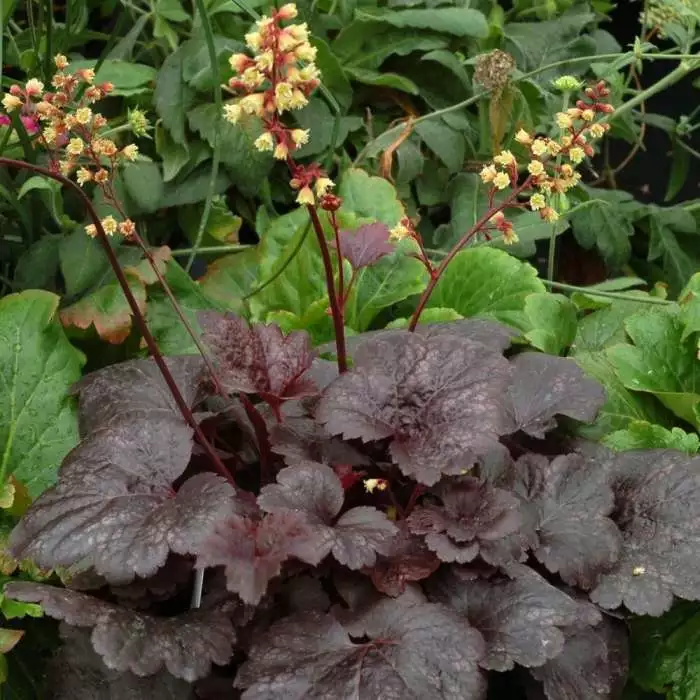 Dark foliage with small yellow flowers. Position: full sun or partial shade Soil: fertile, moist or well-drained soil Rate of growth: average Flowering period: June to August Hardiness: fully hardy The dark plum coloured foliage of this compact Heuchera is ideal for adding contrast to the planting scheme. Equally good in pots or borders, the pretty sprays of yellow flowers, which appear in summer, offer even more interest. Garden care: Heucheras do not like dry soil. Remove tatty foliage in autumn. Lift and divide clumps every couple of years in early autumn and replant with the crown just above the surface of the soil. Apply a generous 5-7cm (2-3in) mulch of well-rotted organic matter around the crown of the plant in spring.