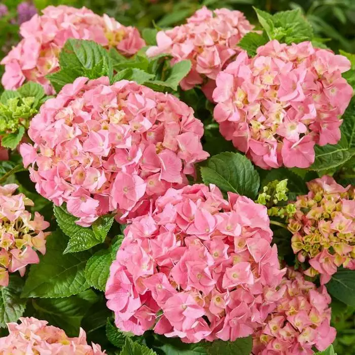 A medium, deciduous, mophead hydrangea shrub with pink flowers from lime buds. Position: full sun or partial shade Soil: moist, well-drained, moderately fertile, humus-rich soil Rate of growth: average Flowering period: June to September Hardiness: fully hardy Grown as an individual specimen in a pot or border, or planted as a lovely big swathe along a valley floor…whatever you choose for your Hydrangea macrophylla ‘Pink’, it will be sure to make a big impact. Lime green emergent flower buds quickly age from slightly pink to really pink and are a perfect match for the bright green, slightly toothed foliage. Hydrangeas give their best pink flowers when grown in soil with a neutral to alkaline pH. Therefore, if you want to make sure that your hydrangeas flowers stay pink (and don’t turn mauve or blue), you will need to make sure that the soils pH does not slip below 6. The easiest way to do this (if necessary) is to apply an annual sprinkling of lime. Garden care: Improve the soil prior to planting by adding plenty of well-rotted manure or garden compost, adding mycorrhizal fungi (Root grow) to aid establishment. Hydrangeas do not like to dry out so keep them well watered during hot, dry weather. If they do start to suffer, soak the roots with a hose and they will usually recover. Remove faded flowerheads in spring after the danger of frosts, cutting back the flowered stems to a strong pair of buds. Take out misplaced or diseased shoots. Mulch young plants with well-rotted manure or compost in spring. Once established, remove a quarter to a third of the shoots to the base of the plant.