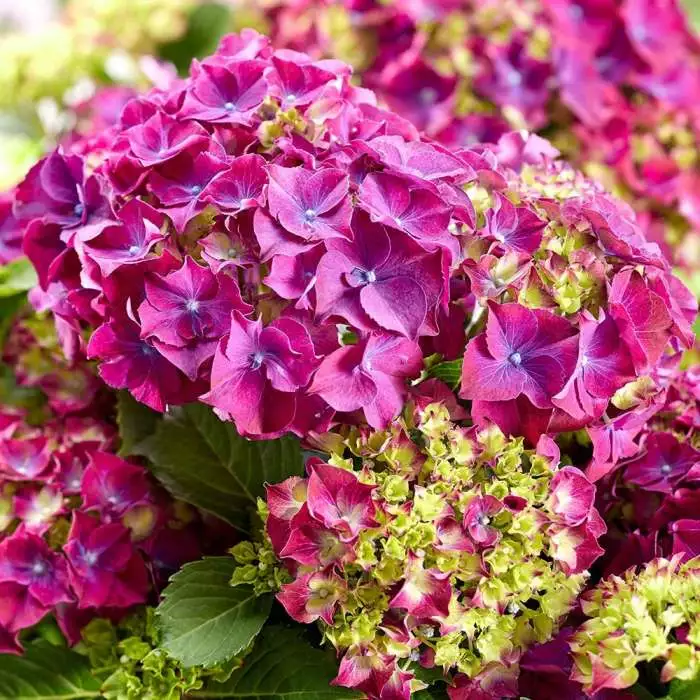 A magenta-purple mophead hydrangea . Position: full sun or partial shade Soil: moist, well-drained, moderately fertile, humus-rich soil Rate of growth: average Flowering period: June to September Hardiness: fully hardy Bright green, toothed foliage emerges in late winter-early spring to clothe this deciduous shrub in a verdant cloak. Soon, lime-green flower buds form, discreet at first and then opening to reveal anything but…impressive purple-magenta mop-headed blooms! Garden care: Improve the soil prior to planting by adding plenty of well-rotted manure or garden compost, adding mycorrhizal fungi (Root grow) to aid establishment. Hydrangeas do not like to dry out so keep them well watered during hot, dry weather. If they do start to suffer, soak the roots with a hose and they will usually recover. Remove faded flowerheads in spring after the danger of frosts, cutting back the flowered stems to a strong pair of buds. Take out misplaced or diseased shoots. Mulch young plants with well-rotted manure or compost in spring. Once established, remove a quarter to a third of the shoots to the base of the plant.