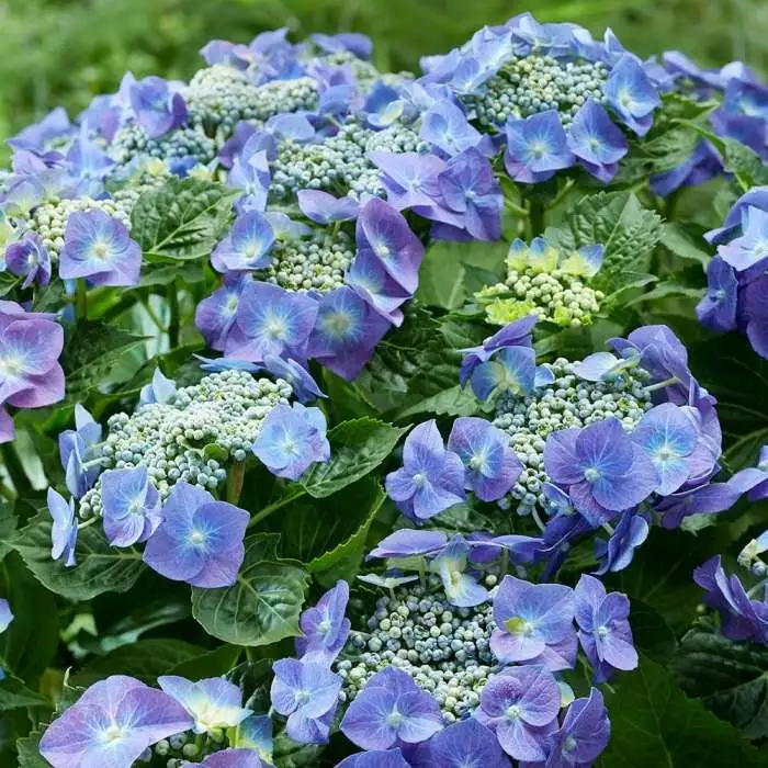 A blue flowering deciduous shrub . Position: full sun or partial shade Soil: moist, well-drained, moderately fertile, humus-rich soil Rate of growth: average Flowering period: June to September Hardiness: fully hardy ‘Teller Blue’ is a mid-sized deciduous shrub with toothed, glossy dark green leaves. From July to September, numerous lilac-blue flattened lacecap flowerheads emerge to provide a fabulous late summer show, perfect either as a single specimen in a pot or border or as a group. Hydrangeas give their best blue flowers on acidic soils with a pH of 5.5. When grown on neutral soil or arriving in our mildly acidic mix, the flowers will predominantly be pink, although you may also get blue or mauve blooms. If you want to make sure that your hydrangea has blue-toned flowers, you will need to make sure your pH does not creep above 6.5. To lower the pH on neutral soil, you can treat it annually with a hydrangea flower colourant containing aluminium salts. Garden care: Improve the soil prior to planting by adding plenty of well-rotted manure or garden compost, adding mycorrhizal fungi (Root grow) to aid establishment. Hydrangeas do not like to dry out so keep them well watered during hot, dry weather. If they do start to suffer, soak the roots with a hose and they will usually recover. Remove faded flowerheads in spring after the danger of frosts, cutting back the flowered stems to a strong pair of buds. Take out misplaced or diseased shoots. Mulch young plants with well-rotted manure or compost in spring. Once established, remove a quarter to a third of the shoots to the base of the plant.