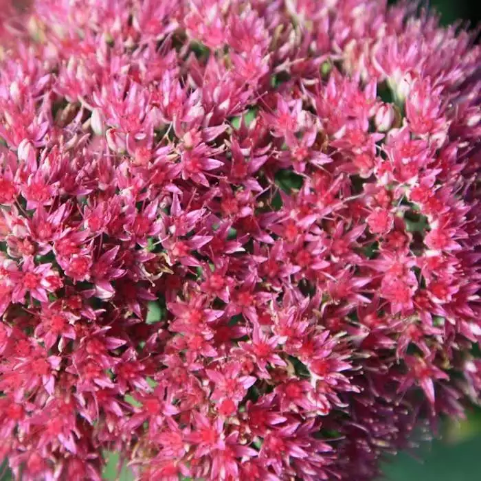 Bright pink flowers in the late summer early autumn. Position: full sun or partial shade Soil: moderately fertile, well-drained, neutral to slightly alkaline soil Rate of growth: average to fast-growing Flowering period: August to November Hardiness: fully hardy Succulent, grey-green leaves, topped with large, flat heads of bright pinkish-mauve flowers in summer. This award-winning ice plant looks great planted in bold drifts towards the front of a sunny, well-drained border. A valuable late source of nectar for butterflies and bees, the flat flowerheads make attractive dried-flowers. Garden care: The flowerheads look great left during the winter to add shape and texture to your border. In February and March cut back the old flowerheads and apply a generous 5-7cm (2-3in) mulch of well-rotted garden compost or manure around the base of the plant. Once established, sedums can have a tendency to flop leaving an open and unsightly centre, especially in fertile soil. One technique to help prevent this is the ‘Chelsea chop’. During the last week of May (RHS Chelsea Flower Show week), cut one in every three stems back to the ground. This will produce plants that are less lush and flower slightly later.