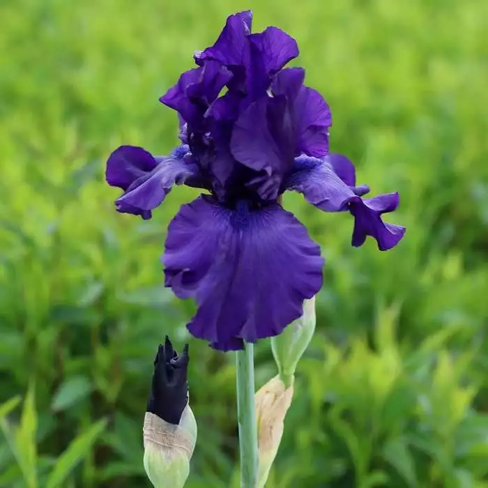 Huge ruffled silky rich purple-blue blooms. Position: full sun Soil: well-drained, moderately fertile soil Rate of growth: average Flowering period: May to June Hardiness: fully hardy A real showstopper this. A stately, bearded iris with huge, ruffled iridescent, purple-blue blooms on strong stems that appear in early summer, each stem carrying up to 13 buds. This is one of the best dark purple-blue irises and looks stunning with other blue and purple flowering plants. Try it dotted around a gravel garden, or in groups in a herbaceous border. Garden care: Plant shallowly with the upper part of the rhizome sitting on the surface of the soil, incorporating a low nitrogen fertiliser in the planting hole. After planting remove the uppermost third of the leaves to protect against wind-rock. In exposed areas stake with bamboo canes in early spring. Remove the stems after flowering from the base as this will concentrate the plant’s energy into producing new rhizomes. Divide and replant about every three years.