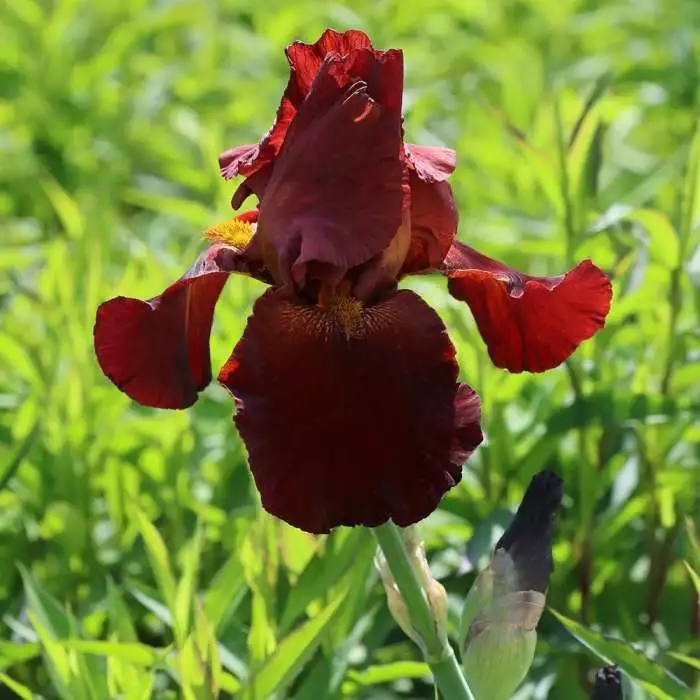 Sultry, maroon flowers. Position: full sun Soil: well-drained, moderately fertile, neutral to acidic soil Rate of growth: average Flowering period: May to June Hardiness: fully hardy A magnificent, sultry, bearded iris, with lustrous, maroon-red flowers held on tall, stiff stems. Like all iris, it’s a natural multiplier so will spread over a number of years. Plant it in bold drifts in a sunny, well-drained border. Garden care: Plant shallowly with the upper part of the rhizome sitting on the surface of the soil, incorporating a low nitrogen fertiliser in the planting hole. After planting remove the uppermost third of the leaves to protect against wind-rock. In exposed areas stake with bamboo canes in early spring. Remove the stems after flowering from the base as this will concentrate the plant’s energy into producing new rhizomes. Divide and replant about every three years.