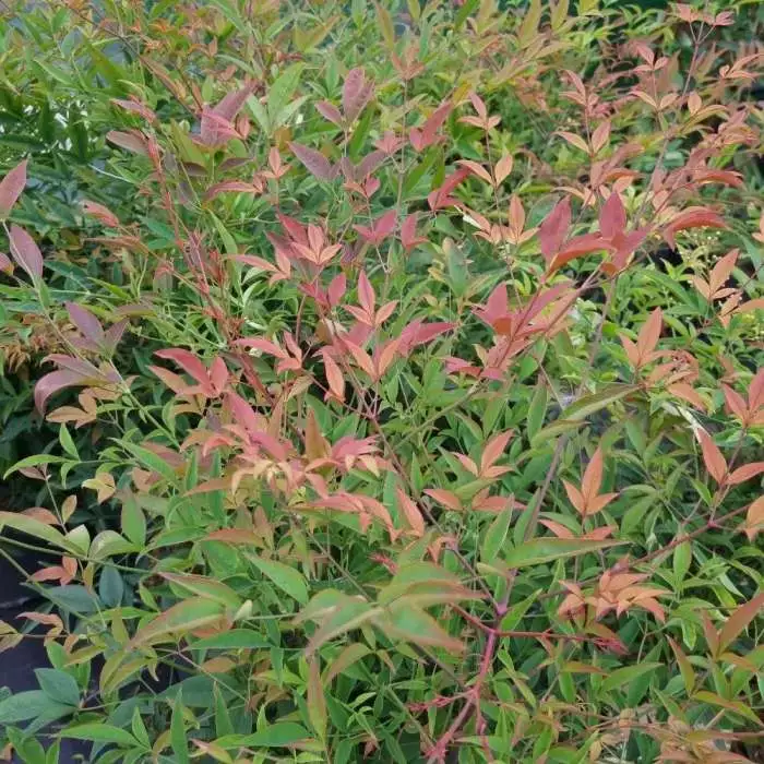 Bamboo-like leaves. Position: full sun or partial shade Soil: moist but well-drained soil Rate of growth: average Flowering period: July Hardiness: frost hardy (may need winter protection) Primarily grown for its attractive foliage, which emerges with a red flush in spring, and often develops a burgundy tint when the temperatures drop in autumn and winter. This elegant shrub can also produce open clusters of white, star-shaped flowers in midsummer, followed by bright red (inedible) fruits. Commonly called heavenly bamboo, it works equally well in borders or large pots, but it’s happiest in a sunny, sheltered site. Garden care: In mid- or late spring lightly cut back any shoots that spoil the symmetry of the plant. Protect from cold drying winds and low temperatures in winter.