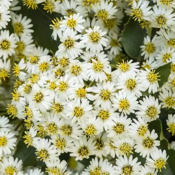 Masses of daisy-like flowers in summer. Good for coastal sites. Position: full sun Soil: fertile, well-drained soil Rate of growth: average Flowering period: July to August Hardiness: fully hardy In July and August this evergreen shrub is smothered with clusters of white, daisy-like flowers with yellow centres. The leaves are glaucous and glossy, and associate particularly well with Mediterranean plants or other plants with silvery foliage. This shrub also makes a fabulous, informal flowering hedge or windbreak for a sunny, well-drained site. It is particularly suitable for coastal gardens as it stands up well to strong winds and salt-laden air. Garden care: When planting Olearia incorporate some well-rotted compost or manure, and mycorrhizal fungi into the planting hole. Remove the faded flowerheads using garden shears. In April or May lightly trim back any branches that spoil the symmetry of the plant. After pruning apply a generous 5-7cm (2-3in) mulch of well-rotted garden compost or manure around the base of the plant.