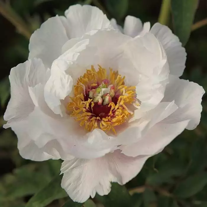 A white, single-flowering tree peony. Position: full sun or partial shade Soil: fertile, moisture-retentive yet well-drained Rate of growth: average Flowering period: May to June Hardiness: fully hardy A vigorous hybrid of Paeonia ostii, ‘Feng Dan Bei’ has large, open white flowers, sometimes with pinkish veins, up to 25cm (10”) across that open to float like waterlilies upon a pool of bottle-green foliage. One of the first peonies to flower, it also has a heady perfume as well. A long-lived, spectacular tree peony for any garden border, bed or suitably large pot. Our woody-stemmed peonies are field-grown, sturdy plants with extensive roots that have been potted up since lifting in the Autumn. When purchasing earlier in the season (Feb-March) the root system should be well developed although you may find some compost falls away when you are planting them out and this is perfectly natural for the time of year. Garden care: Deadhead after flowering. In early spring apply a top-dressing of a balanced slow release fertiliser around the base of the plant and mulch with well rotted garden compost or manure. The older stems of tree peonies have a tendency to become brittle and snap so cut these back to the ground in autumn every two or three years.