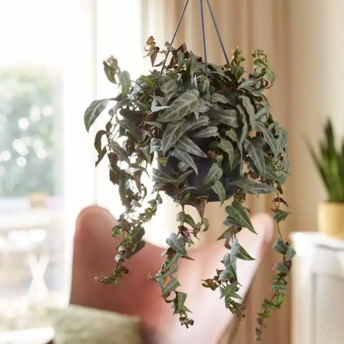 Stiking foliage in a hanging basket. Position: bright, indirect light Soil: good potting compost Rate of growth: average to fast Hardiness: tender (indoors only) Current height: approximately 40cm (+ or – 10% including the pot) Pot: supplied in a hanging pot ready to hang In its native environment, this plant would typically grow as a climber, but if its stems are unsupported, it makes a handsome trailer that will cascade over the edges of a pot. The arrow-shaped leaves of this unusual house plant are a deep greyish green, but each one is attractively patterned with a network of silvery veins – and the undersides have a burgundy flush. Home care: Originating from tropical regions, they like relatively stable temperatures (ideally above 15°C) and a well-lit position that does not get direct sunlight (think steamy jungle!). Water regularly in the growing season, making sure the compost gets dry to the touch before repeating the process, and cut back a little in winter. Often referred to as the sugar grape, they can produce tiny beads of an (inedible) sugary substance on the foliage. This is completely harmless and can either be brushed or washed off. Please note: all our indoor hanging pots include drainage holes to prevent waterlogging. We recommend taking them down to water in the sinkor on a saucer, and leaving them to drain before rehanging.