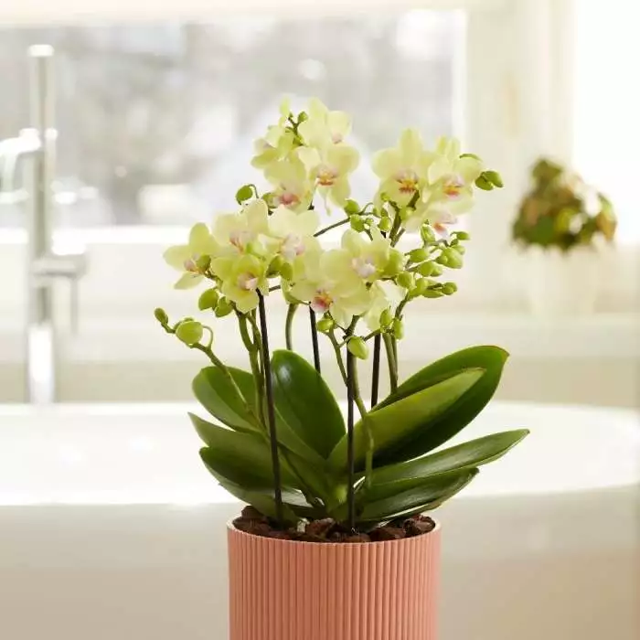 This orchid will flower for several months. Position: bright but indirect light Soil: these plants do not need to grow in compost, but if potting up, use a specialist orchid compost Rate of growth: average Hardiness: tender (indoors only) Current height: approximately 40cm (+ or – 10% including the pot) Pot cover: choose an orchid high pot cover to give a good fit over the pot Sought after for its ability to produce small, softly coloured flowers over many months, this easy to grow phalaenopsis orchid will look wonderful in the home. As its name suggests, ‘Boquetto Sensation’ makes a great alternative to a bouquet of flowers. Please note that the pot in the photograph is not supplied with the plant (which is sent out in a simple nursery alternative), but we have a wide and wonderful range on our website to choose from. Home care: Keep the compost moist during the warmer months, but in winter you should reduce the amount it gets, and only water occasionally. Ideally when watering, you should let them stand in a tray of water (or kitchen sink) so they can soak up as much as they like for an hour or two. Afterwards, let the excess water drain away completely. It is always best to give them a good soak when they get quite dry, rather than watering little and often. Their preference is for soft, tepid water. They love humidity, so a bright kitchen or bathroom would be ideal, and mist the leaves with water occasionally, especially if they are in a heated room. Don’t worry if the roots grow outside the pot. In their native environment, they grow in the crooks of branches, and use these aerial roots to absorb water from the air. They do not mind being overcrowded in their pots, so you only need to repot them when the growth starts to suffer. They usually only send up flower spikes once a year, however you may encourage a second flush of flowers to form more quickly if you trim back the stem to just above the first node immediately after they have finished flowering. They prefer even temperatures, so try not to have big drops at night time.