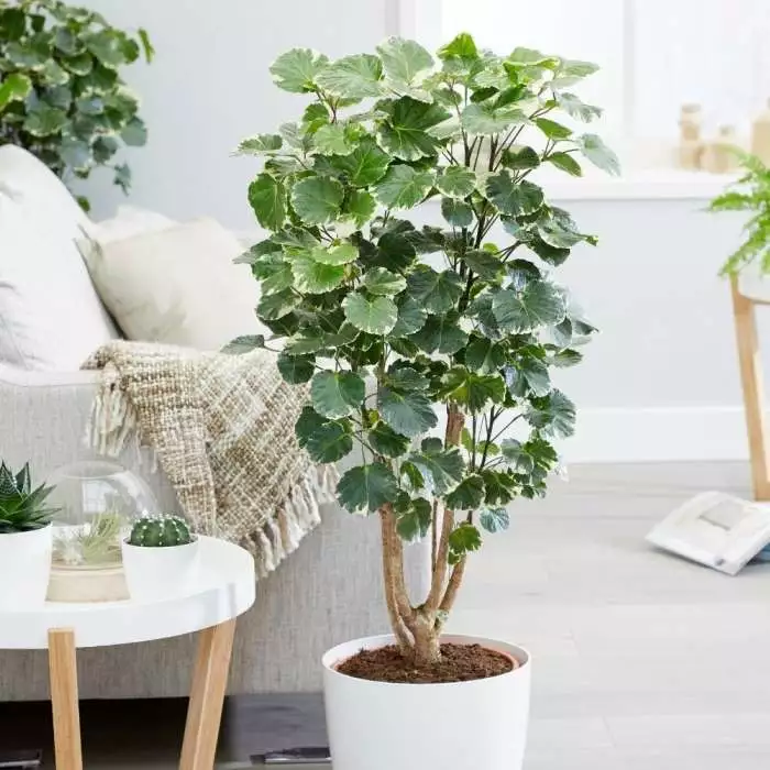 Near-circular leaves. Position: bright indirect light Soil: good potting compost Rate of growth: average Hardiness: tender (indoors only) Current height: approximately 90cm (+ or – 10% including the pot) Pot cover: choose a 22cm pot cover to give a good fit over the pot The upright habit of this house plant makes it perfect for smaller rooms, hallways or tight corners. Its stems are clothed with glossy leaves, which are almost circular (hence it sometimes being referred to as the dinner plate aralia), but its outer edge is gently scalloped, and it has a purple flush to the underside. Please note that the pot in the photograph is not supplied with the plant (which is sent out in a simple nursery pot). They do however make excellent potted plants, and if you wish to pot yours up, we do have a wide range of pots on our website to choose from. Home care: Water moderately when in growth, allowing the top of the compost to dry out before repeating the process, and keep drier in winter. Mist the leaves occasionally with water and make sure winter temperatures are maintained above 15°C. Repot every couple of years.