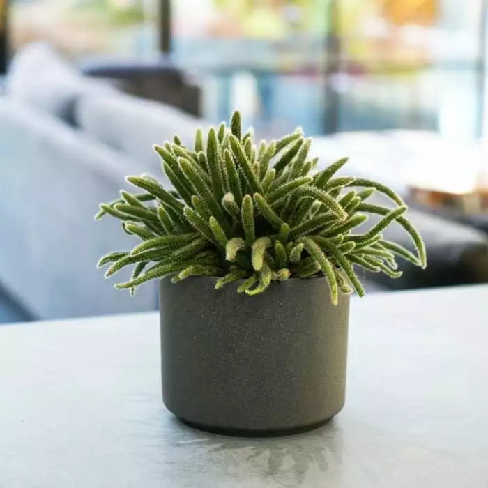 A shaggy-haired trailer. Position: bright but indirect light Soil: good potting compost Rate of growth: average to fast Hardiness: tender (indoors only) Current height: approximately 20cm (+ or – 10% including the pot) Pot cover: choose a 14cm pot cover to give a good fit over the pot The pale green stems of this trailing succulent are smothered in fine bristles, and as the plant matures, small pale yellow flowers could also appear along their length. These may be followed by berry-like fruits, which look a little like mistletoe – hence its other common name of mistletoe cactus. An undemanding plant that originates from Madagascar, it’s ideal for a novice indoor-gardener. Please note that the pot in the photograph is not supplied with the plant (which is sent out in a simple nursery pot). They do however make excellent potted plants, and if you wish to pot yours up, we do have a wide range of pots on our website to choose from. Home care: Place it in a bright spot and in spring and summer, water when the compost gets dry, but make sure it never sits in excess water for any length of time. In autumn and winter cut back on the watering but do not let it dry out completely. Avoid a humid atmosphere (no bathrooms or steamy kitchens) and in the warmer months, open a window or door occasionally so it can enjoy the fresh air. Repot every year or two into a slightly larger pot using cacti compost.