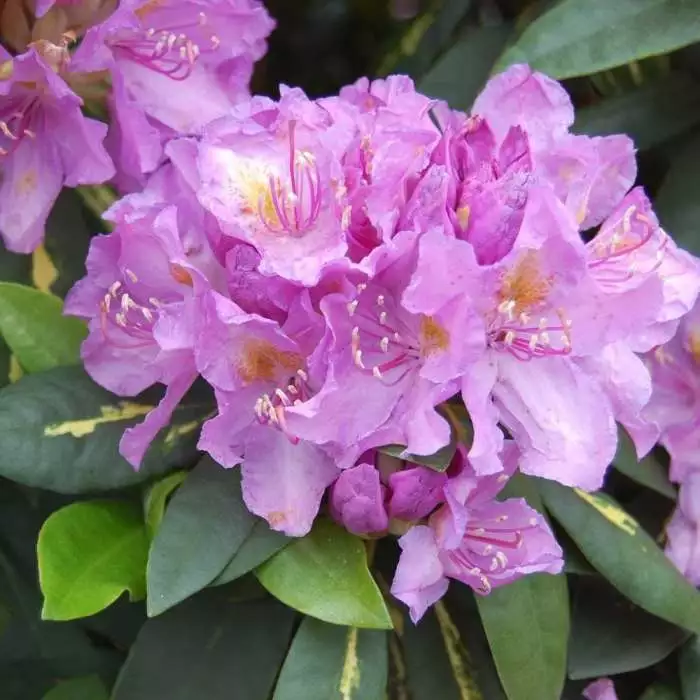 Pretty mauve flowers. Position: partial shade Soil: moist, well-drained, humus-rich, acid soil or ericaceous compost Rate of growth: average Flowering period: May to June Hardiness: fully hardy Small trusses of purplish-pink, trumpet-shaped flowers in May and June and gold flecked, dark green leaves. This hybrid, evergreen rhododendron is one of the few varieties with variegated foliage. The golden markings in the centre of the leaves make it a handsome, year round plant for a shrub border with humus-rich, acid soil. Garden care: Avoid planting too deeply. Apply a generous 5-7cm (2-3in) mulch of leaf mould around the base of the plant each spring.