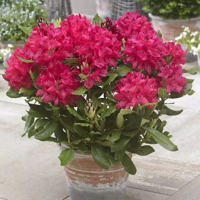 Vivid red flowers. Position: full sun or partial shade Soil:moist, well-drained, humus-rich, acid soil or ericaceous compost Rate of growth: fast-growing Flowering period: April and May Hardiness: fully hardy Rounded trusses of deep red, funnel-shaped flowers in mid and late spring with attractive dark green leaves, retained all year. This vigorous, large flowered rhododendron copes well with extremes of temperatures. Ideal for a well-drained border with humus-rich, acid soil, each of the lavish flowers has a distinctive violet-brown mark in the centre. Please note that the pot in the photograph is not supplied with the plant (which is sent out in a black plastic pot). They do however make excellent potted plants, and if you wish to pot yours up, we do have a wide range of pots on our website to choose from. Garden care: Avoid planting too deeply. Apply a generous 5-7cm (2-3in) mulch of leaf mould around the base of the plant each spring.