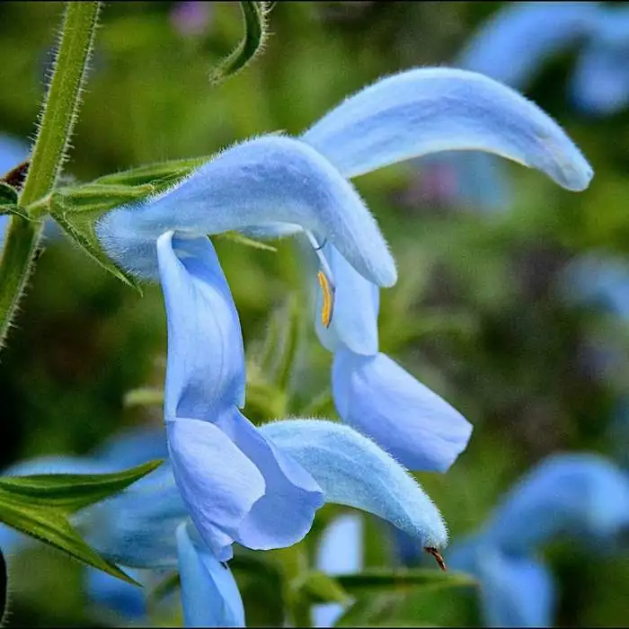 A compact, azure blue flowering herbaceous perennial sage. Position: full light (with shade from hot sun) Soil: well-drained Rate of growth: average Flowering period: July to September Hardiness: frost hardy (will need winter protection) A compact herbaceous gentian sage with spikes of glacial blue flowers producing mounds of deer resistant, aromatic foliage well into autumn. ‘Beyond Blue’ is cool companion for other late-flowering perennials such as Rudbeckia ‘Goldsturm’ and Echinacea ‘White Swan’ or in pots and containers to be brought inside during the winter to a frost-protected, brightly lit spot. Garden care: Plant ‘Beyond Blue’ with a handful of well-rotted compost or manure in the planting hole. Pinch out young growing tips early in the season to encourage the bushy form if growing in containers. To prolong flowering remove the flower spikes as soon as they start to fade. Apply a generous 5-7cm (2-3in) mulch of well-rotted garden compost or manure around the base of the plant in spring. Avoid ground conditions where the soil is very cold and wet, and take cuttings towards the end of the summer to insure against winter losses. Wait until late spring to cut the old growth down.