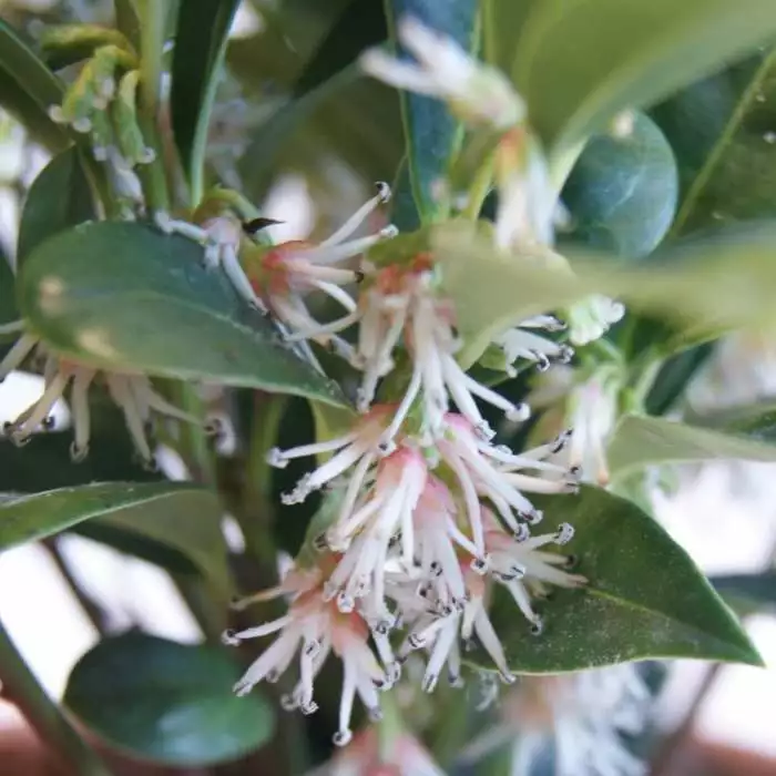 Sweetly perfumed flowers in early spring. Position: partial shade Soil: moderately fertile, humus-rich, moist, well-drained soil Rate of growth: slow-growing Flowering period: late winter and early spring Hardiness: fully hardy A tough and adaptable evergreen, that can be potted up or planted out. It tolerates dry, shady conditions (although it will need to be watered well until it has become established), so it is ideal for those tricky spots beneath established trees and larger shrubs. It forms a dense and uniform cluster of lustrous, rich green foliage, and in late winter and early spring, the tops of the stems are threaded with small, creamy white flowers that have a deliciously sweet, knockout scent. Garden care: If necessary after flowering lightly trim or prune back shoots that spoil the plant’s symmetry. After pruning apply a generous 5-7cm (2-3in) mulch of well-rotted compost around the base of the plant.
