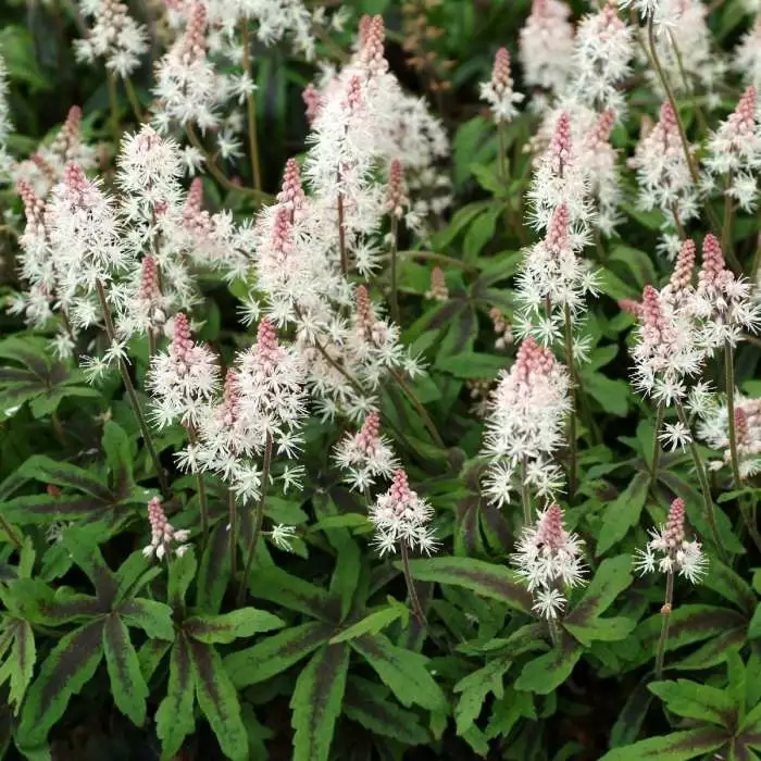 An attractive, shade-tolerant groundcover. Position: partial or deep shade Soil: cool, moist, humus-rich soil Rate of growth: fast-growing Flowering period: May to July Hardiness: fully hardy Attractive, deeply lobed leaves with a small dark blotch in the centre, make a great carpet of foliage throughout the summer. In late spring, slender stems rise up and hold spikes of tiny star-shaped, blush white flowers. This is a brilliant plant for covering the ground in a shady spot – plant it in large numbers for best effect. Garden care: Removing the faded blooms regularly will prolong flowering and encourage more to come. Cut back and compost the spent flower stems in autumn and apply a dry mulch around the crown of the plant to protect against frost damage.
