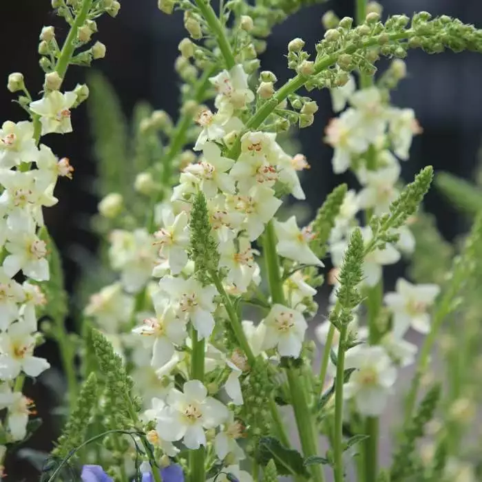 Saucer-shaped white flowers with mauve centres. Position: full sun Soil: poor, well-drained, alkaline soil Rate of growth: average Flowering period: May to August Hardiness: fully hardy (but short-lived) Bold spires of saucer-shaped, white flowers with mauve centres from May to August. One of the most reliable and long-flowering varieties of verbascum. Seeds sown in a cold frame in late spring or early summer produce rosettes of hairy, mid-green leaves and flowers the following year. Perfect for a sunny border. Garden care: Apply a 5-7cm (2-3in) mulch around the base of the plant in autumn to protect from winter extremes, taking care not to cover the crown. Stake in spring with bamboo canes or twiggy prunings before the flowers appear. Mullein moth caterpillars can be a problem, so pick off the insects in early June as soon as they appear. Remove faded flower spikes. It is worth keeping in mind that these plants are mainly biennial, so although they usually self-seed freely, the plant will only live for two years.
